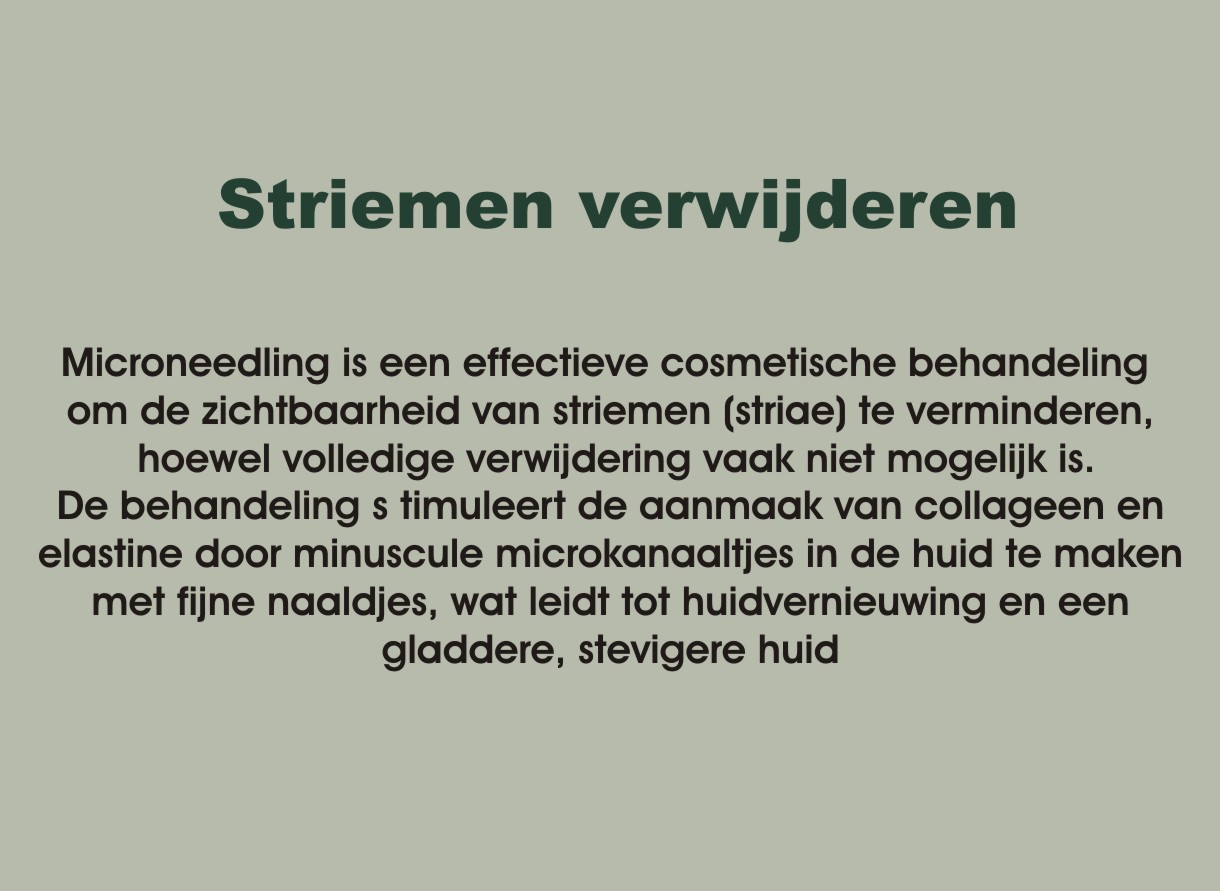 Er zijn gemiddeld 3-5 behandelingen nodig, om de 4-6 weken, voor het verwijderen van de huidstriemen. Na elke behandeling is er een verbetering in kleur en textuur zichtbaar. Als gevolg van het verhoogde collageen niveau en de aanmaak van nieuwe huidcellen in en rondom het probleemgebied zal er ook een huidverjonging plaatsvinden. Er zijn na de behandelingen geen onderhoudsbehandelingen nodig als er geen verandering in gewicht plaatsvindt of nieuwe striemen ontstaan.